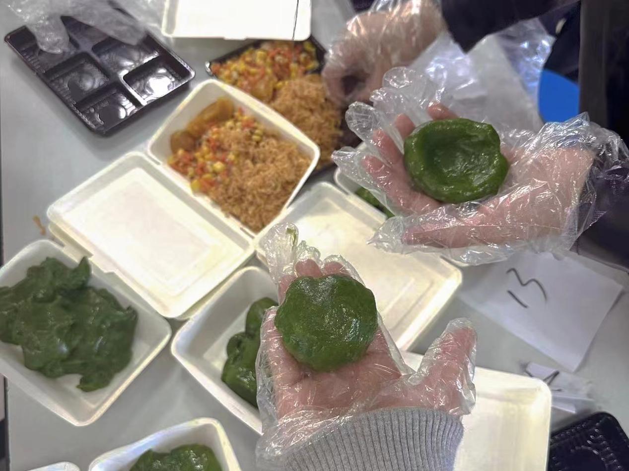 活动伊始,宿管阿姨以她们娴熟的手法为同学们演示了青团的制作流程,从材料准备到和面、包馅、成型,每一个步骤都细致入微,耐心讲解。同学们纷纷围在阿姨身边,目不转睛、全神贯注地学习着。