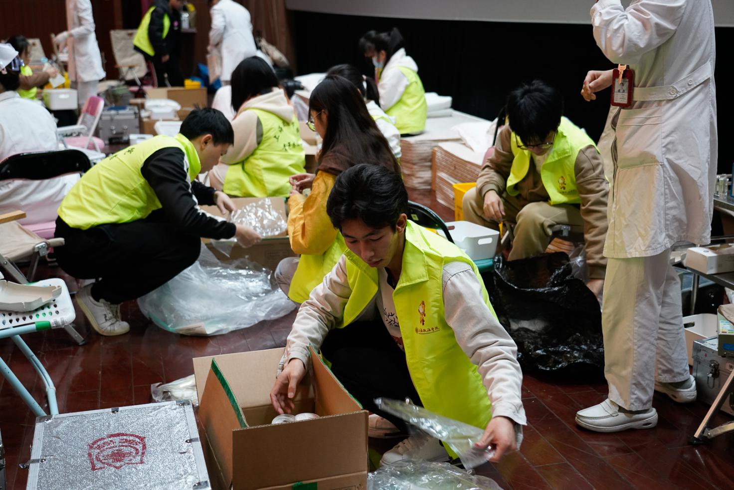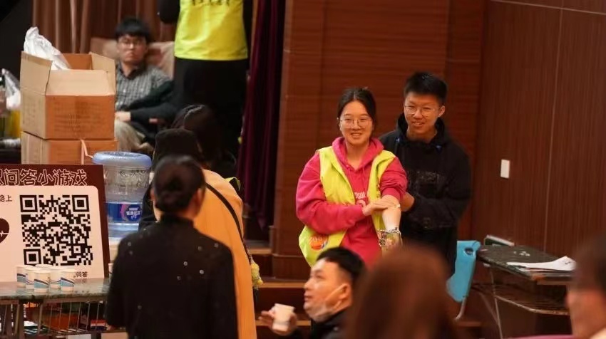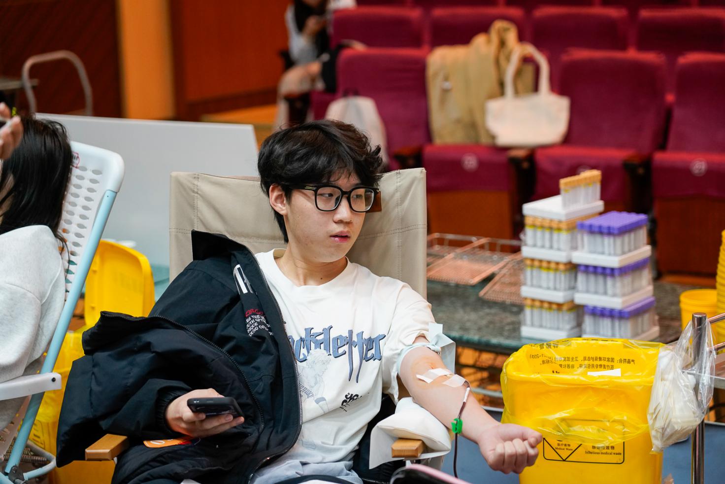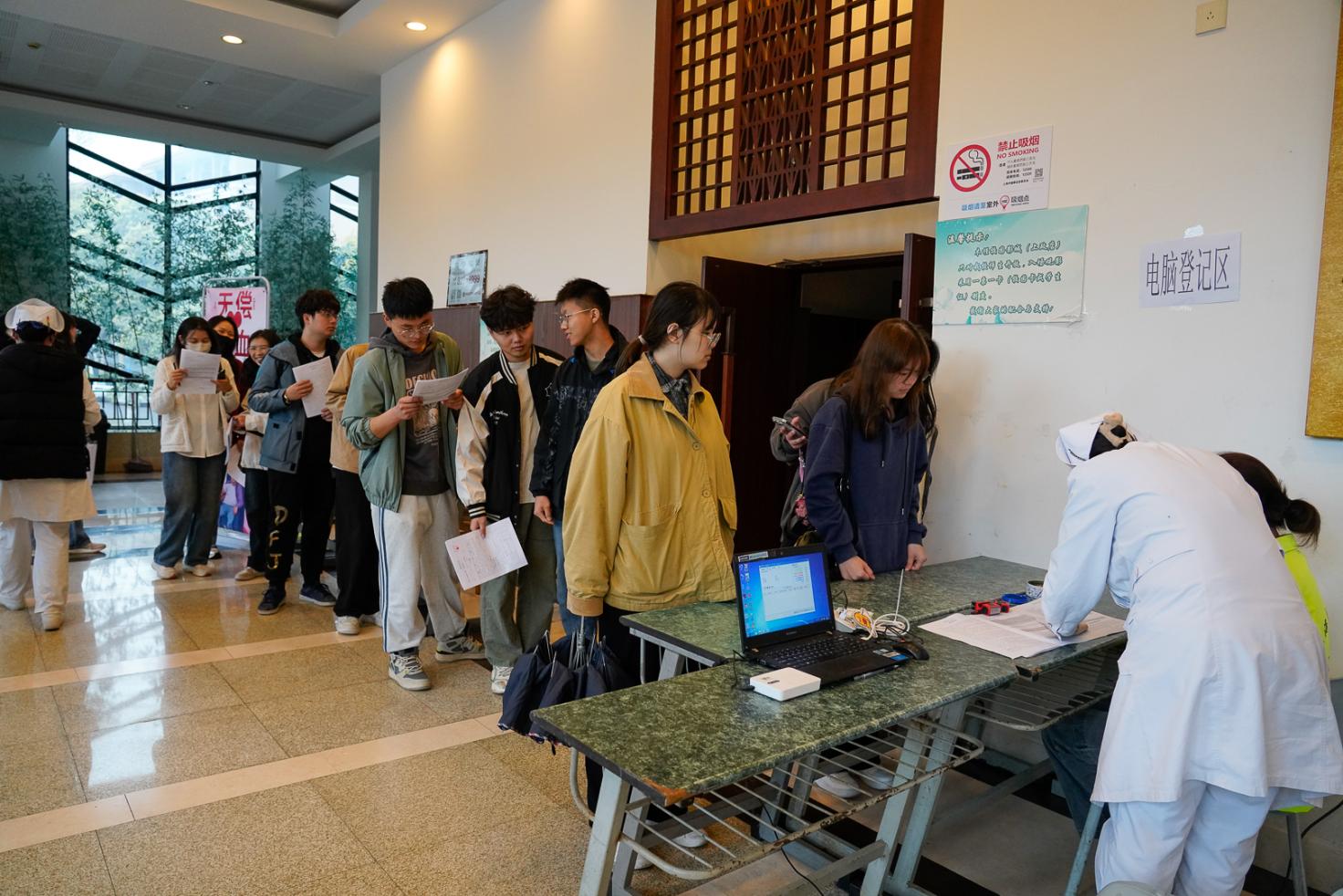 天马讲堂外,参加献血的师生在现场志愿者的引导下,早早便有序排队等候,依次在登记区、体检区、写卡区完成个人信息登记、健康体检等流程。