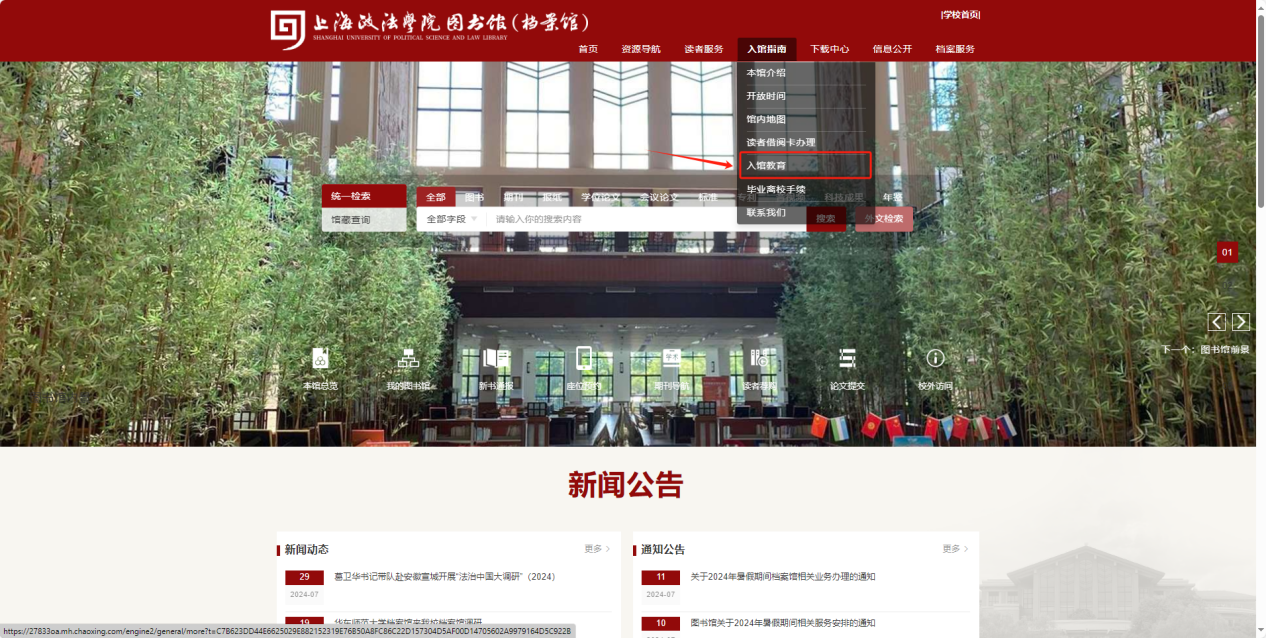 1.图书馆主页导航栏→入馆指南→入馆教育。