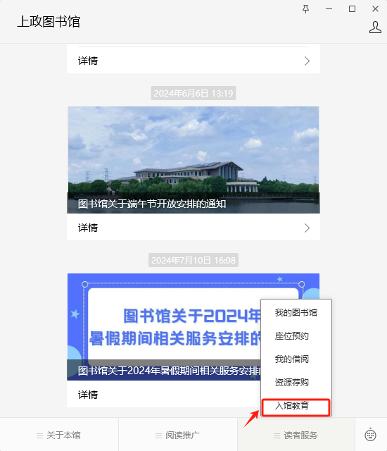 3.进入微信搜索公众号“上政图书馆”,点击关注,进入上政图书馆公众号,点击“读者服务-入馆教育”。