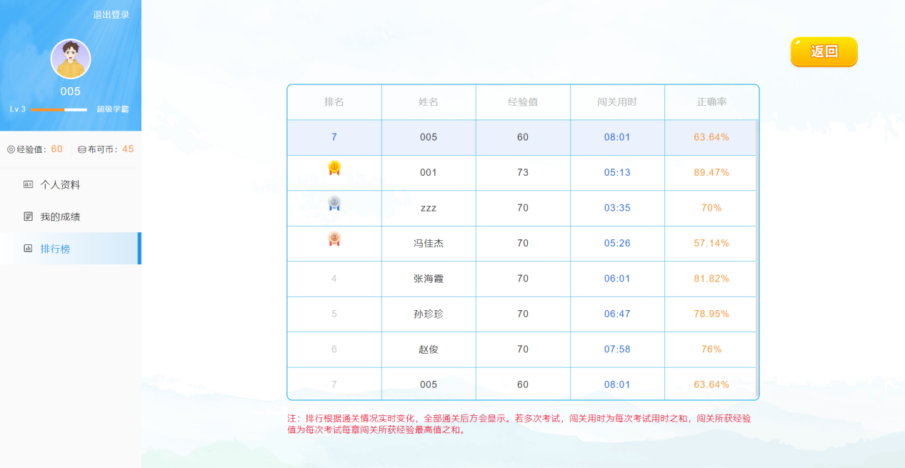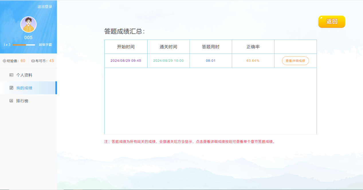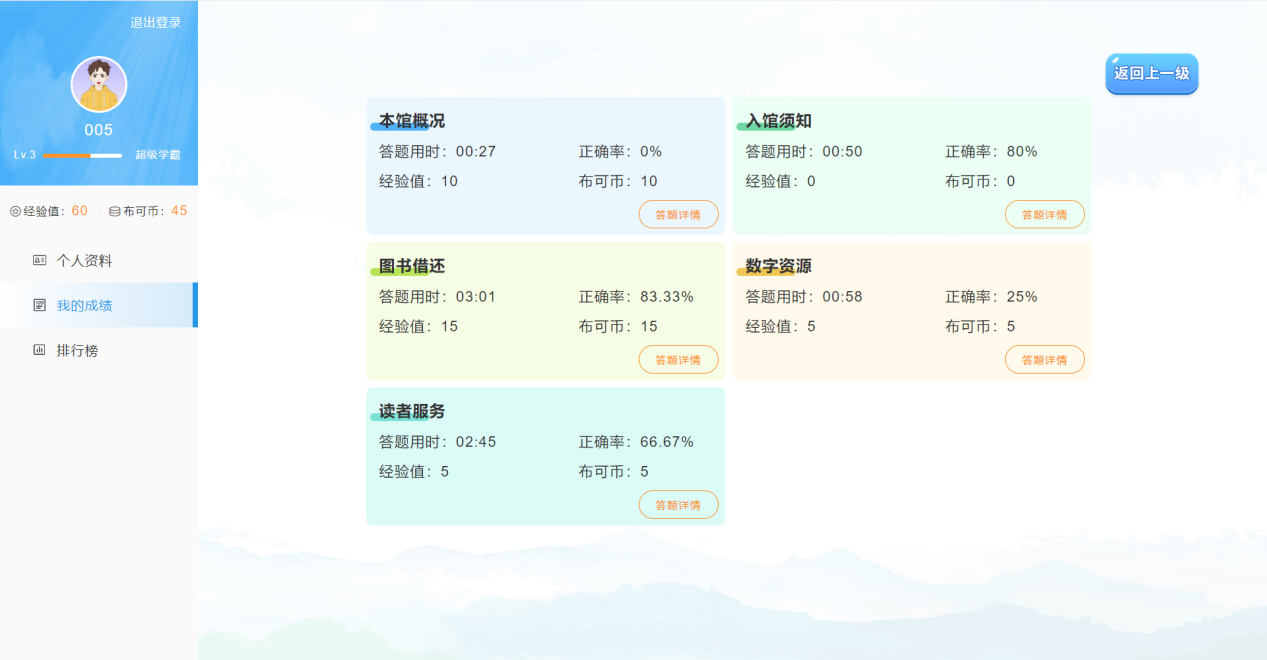 1. 所有的学习和闯关都完成后,可以在个人中心查看个人成绩和排名,查看经验值和布可币的获取情况,答题详情也会在这里展示哦~