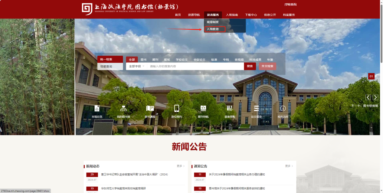2.图书馆主页导航栏→读者服务→入馆教育。
