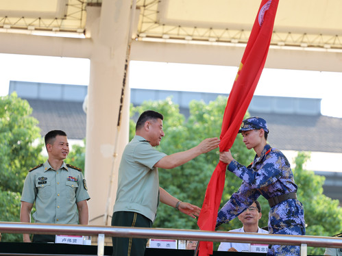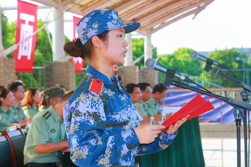 李杰向参训学生代表授旗,张涛迎请军训教官入列。来自三营五连二十三排的谢文怡同学、三营五连二十五排的李晨教官分别作为参训学生代表、教官代表发言。