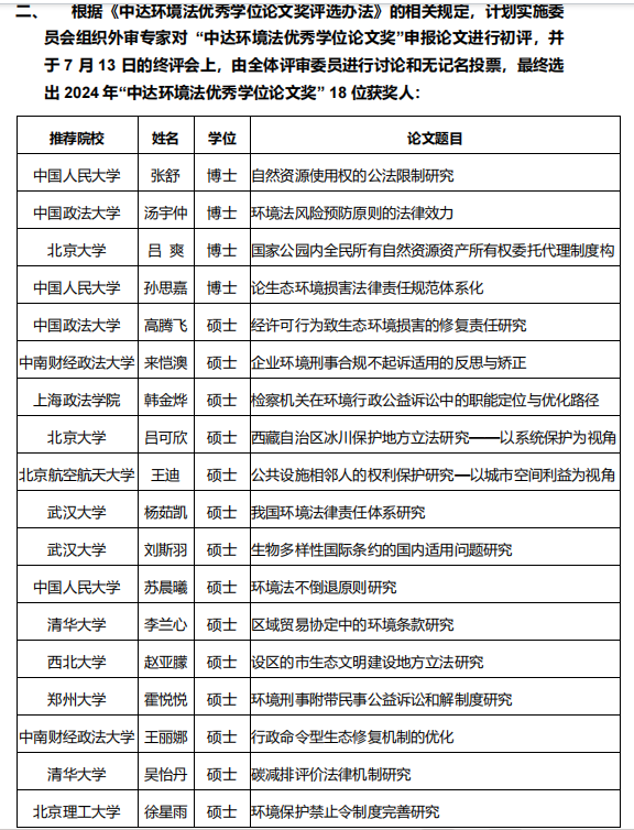 “中达环境法优秀学位论文奖”是“中达环境法学教育促进计划”设立的重要奖项之一。2024年6月,我校组织学位论文以环境法、自然资源法和能源法为主要内容的应届硕士研究生申请该奖项,有关学院与职能部门预评审后择优予以推荐。