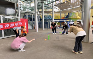 在教练的指引下,教职工们在“马兰花开”热身破冰活动结束时完成分组。活动中,每组成员都充分发挥各自的特长和优势,群策群力,充分展现了齐心协力的团队精神,共同完成了“互动飞盘”“合力筑塔”“蜂巢塔高空探险”等项目。