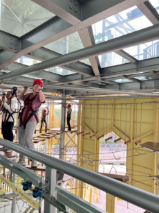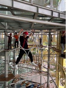 “蜂巢塔高空探险”项目是集宇宙探索空间、高空探险、攀岩、飞拉达、滑筒、快跳、高空秋千等9大特色体验于一体的极限高空拓展项目,共有初、中、高不同难度超266个关卡探险。每个关卡都充满困难和挑战,所有人都尽可能地挑战自我,彰显了新进教职工积极奋进、敢于拼搏、开拓进取的精神风貌和“不抛弃,不放弃”的团队信念。