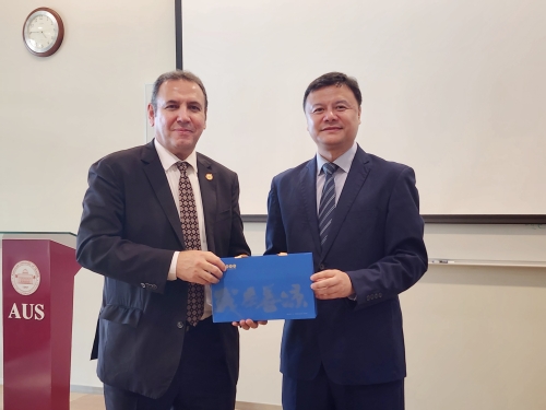 在沙迦美国大学,该校代理教务长、国际交流办公室主管、文理学院院长、工商管理学院副院长、国际研究系主任与我校访问团进行座谈交流。沙伽美国大学校方代表介绍了学校的办学背景、专业设置、人才培养理念以及科研条件、国际交流项目等,尤其介绍了与我校相关专业的工商管理硕士、汉语言文化教学等课程。