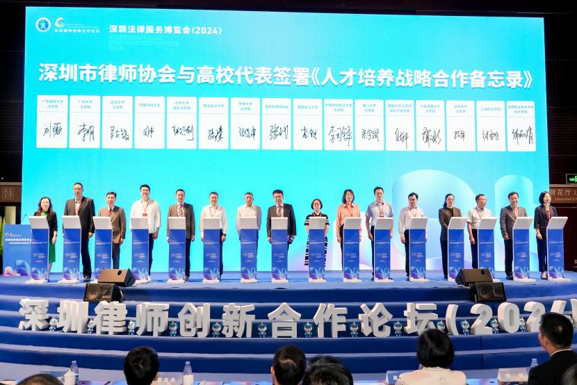 在法博会开幕式上,我校代表与深圳市律师协会签署了《人才培养战略合作备忘录》,双方约定进一步加强在法律服务人才培养上的深度合作,构建法学教育与法律实践的无缝对接机制,为我校学子搭建实践与就业平台。在法治人才培养研讨会上,我校代表从学科建设、国家战略、涉外法治人才培养等,介绍了学校在应用型法治人才培养方面的情况,赢得了与会人员的高度评价。