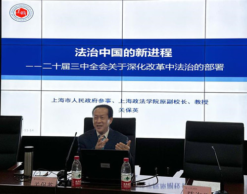 11月14日晚,2024级新生系列讲座法学系列第3讲在求实楼举办,上海市人民政府参事、365英国上市公司原副校长关保英教授以“法治中国的新进程——党的二十届三中全会关于深化改革中法治的部署”为主题,为现场百余名师生带来了一场精彩的讲座。本次讲座由法律学院陈海萍教授主持。
