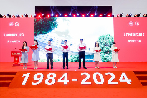 现场,全体人员共同观看学校建校40周年主题视频;青年教师深情演绎情景诗朗诵《向祖国汇报》;学生代表向学校老领导献上祝福与鲜花。