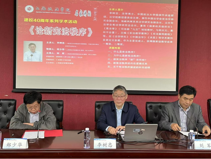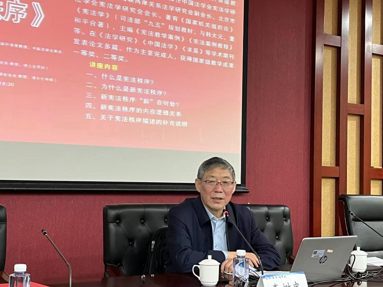 李树忠教授围绕新时代宪法秩序的规范内涵做了详细阐释,他主要从“什么是宪法秩序”“为什么是新宪法秩序”“新宪法秩序新在何处”以及“新宪法秩序的内在逻辑关系是什么”四个方面进行了细致的讲解。讲座过程中,李树忠教授从应然和实然两个维度阐释了宪法秩序的概念,并从党的领导、依宪治国、依规治党和新宪法秩序的制度安排四个方面详细阐述了新宪法秩序“新”在何处。他强调,新宪法秩序并不意味着与旧秩序的断裂,而是在继承和发展中不断创新和完善。在谈到新宪法秩序的内在逻辑关系时,李树忠教授表示,党的领导、依宪治国和依规治党三者相辅相成,共同构成了新宪法秩序的核心要素。李树忠教授指出,对宪法秩序的研究方法既是法律学的,也是政治社会学的,是对宪法文本的解释,对宪法实践中形成的宪法秩序样态的描述。
