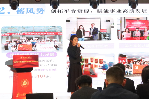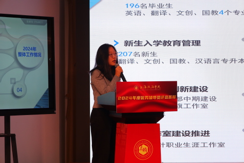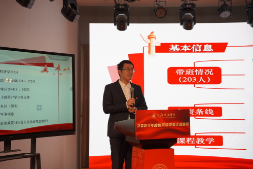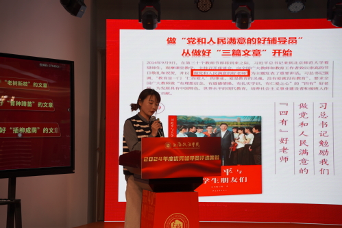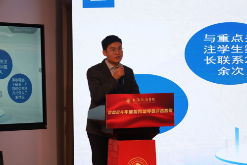 本次评选答辩会主题为“弘扬教育家精神,凝聚思政引领力”。根据答辩要求,各二级学院推荐的14名专职辅导员围绕全年基本工作完成情况、工作亮点、特色成果、工作思考及建议逐一上台进行答辩展示。