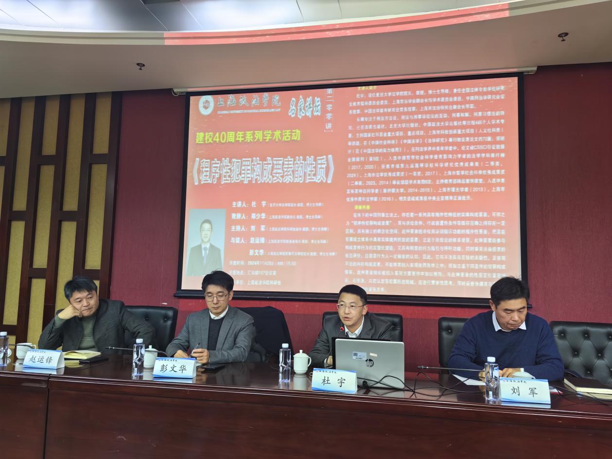 刘军教授表示,杜宇教授的讲座以深邃的理论高度和丰富的实践深度,充分彰显了他在该研究领域内的渊博学识和卓越的前瞻性思考能力。与谈环节,赵运锋教授阐述了自己对于程序性犯罪构成要素定性的不同观点,他从犯意发生时间与犯罪行为发生不一致的角度阐述了归属客观处罚考虑。彭文华教授从侵犯国家权益类犯罪与自然法法益的差异,表达了自己的观点。不同观点的碰撞极大地深化了师生们对这一问题的理解,更激发了他们对刑事法学研究的浓厚兴趣与热情。
