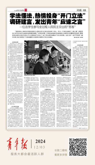 “现在,我在一家国企当法务实习生,法律专业能力得以进一步锻炼,也在业务处理中寻找新的立法需求,希望未来能继续为全过程人民民主注入青春力量,发出青年之声。”袁阳洋充满新的期待。