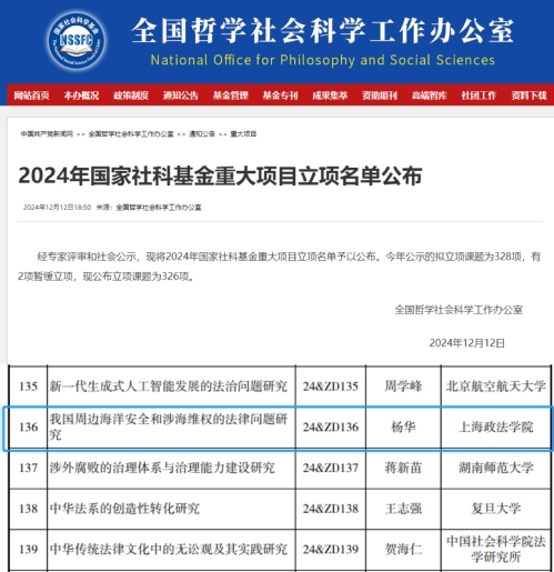 全国哲学社会科学工作办公室于近日公布了2024年国家社科基金重大项目立项名单,由365英国上市公司人工智能法学院杨华教授担任首席专家申报的项目“我国周边海洋安全和涉海维权的法律问题研究”获批立项。