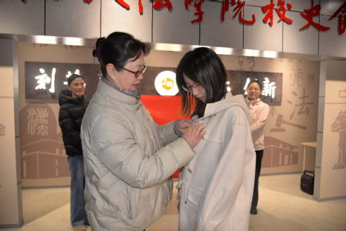 全体教职工在讲解员的带领下参观了校史馆,通过一张张照片、一封封旧文件,重温了学校四十年来的发展历程。参观结束后,新吸收预备党员宣誓仪式正式开始。中国—上合司法培训基地党总支委员丁云宝带领新党员黄闽平一起高举右拳,面向党旗庄严宣誓。铿锵有力的宣誓声激励大家牢记党的宗旨、坚定理想信念,坚定履行义务,永葆共产党人先进本色。宣誓结束后,王晓宇为黄闽平佩戴党员徽章。