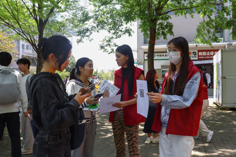在活动现场,志愿者们布置了国家安全教育的宣传海报,同学们可以通过扫描海报上的二维码进行答题,学习国家安全知识,提高自觉维护国家安全的意识。此外,景行反诈防骗工作室的指导老师胡萍和裘欣璐带领志愿者们向同学们分发了反诈防骗教育手册,通过宣传常见诈骗形式和典型诈骗案例警示同学们不要轻易相信网络和社会上的信息,以免落入骗局。