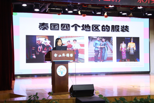 泰国留学生爱丽根据地理环境、气候特征、文化习俗和经济发展等因素,介绍了泰国四个主要地区的文化,并根据分享内容与同学们进行互动。俄罗斯留学生娜妍详细介绍了俄罗斯的地理环境、城市特色、文化特点、饮食服装等。台下学生纷纷举手提问,现场气氛热烈。
