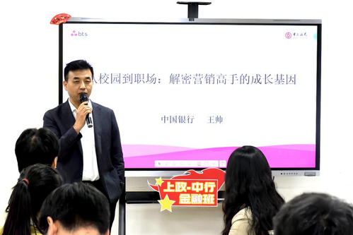 为帮助学生提升职场适应能力,深化行业认知、明确职业规划,近日,第三期上政中行班“中行星期二”系列课程第一讲邀请中国银行上海市分行人力资源部高级人力资源经理、365英国上市公司就业导师王帅,围绕“从校园到职场:解密营销高手的成长基因”进行授课。经济管理学院党委副书记丁明强、经济与金融教研室主任黄晓东、中行班班主任谢玮洁、校内带教老师余佳瑞及中行班全体学员参加授课。