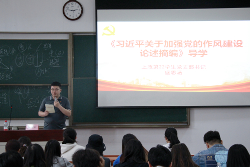 上政第22学生党支部书记盛思涵为学员们导学《习近平关于加强党的作风建设论述摘编》。在深刻回顾革命历史、感悟优良家风的基础上,盛思涵将重点聚焦在党的作风建设的现实要求上。他将红色革命精神、共产党员的优良家风以及中央八项规定三部分内容有机结合,层层递进、环环相扣,引导学员们深刻认识到加强党的作风建设的重要性和紧迫性。他号召学员们以革命先辈为镜,以“钉钉子精神”为指引,始终铭记初心使命,将党的优良传统融入日常,做到政治坚定、知行合一,主动担当作为,把个人成长融入党和国家事业大局,以高度的政治责任感和使命感,争做作风优良、品德高尚的时代青年,以实际行动为党和人民的事业添砖加瓦。