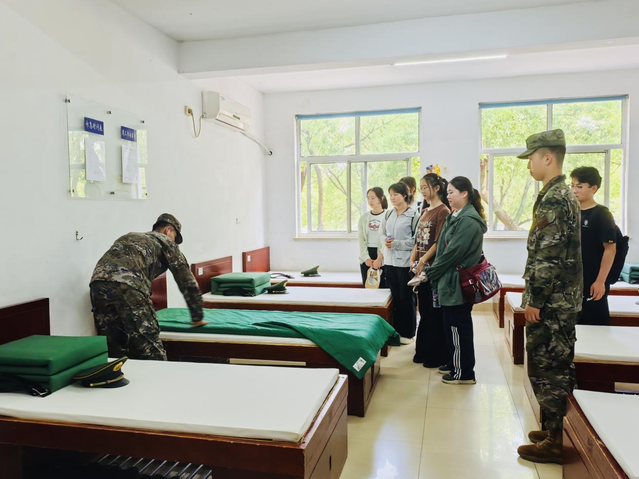 随后,战士为学生们展示了军营内务整理的“硬核”标准,从被褥叠放、物品摆放到卫生清洁,展现军营严谨细致的作风。在战士的指导下,学生们动手体验“豆腐块”被子的叠法,从铺平压实到精准折痕,每一步都考验着耐心与专注力。学生们纷纷表示:“看似简单的内务整理,背后是日复一日的坚持。劳动不仅是体力付出,更是习惯与意志的磨炼。”