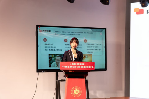 叶卉宣读了获奖名单。经过激烈角逐,蒲妍荣获一等奖,郑一丹、曹靖旋获得二等奖,昂格丽玛、高菡聆、蒋泽宇获得三等奖,韩雨默、蔡沁音、韩雨洁、陈骏洋获得优胜奖。获奖代表曹靖旋分享了参赛心得,表示将继续深耕专业阅读,提升法学素养。