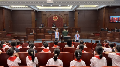 在“多彩上政”路线2宣讲成员的讲解下、“红育先锋队”党员的陪伴下,小学生们通过沉浸式体验模拟法庭情景剧、趣味国防体能挑战、参观上政图书馆等环节,在行走的课堂中感受法治力量,磨砺意志品格。
