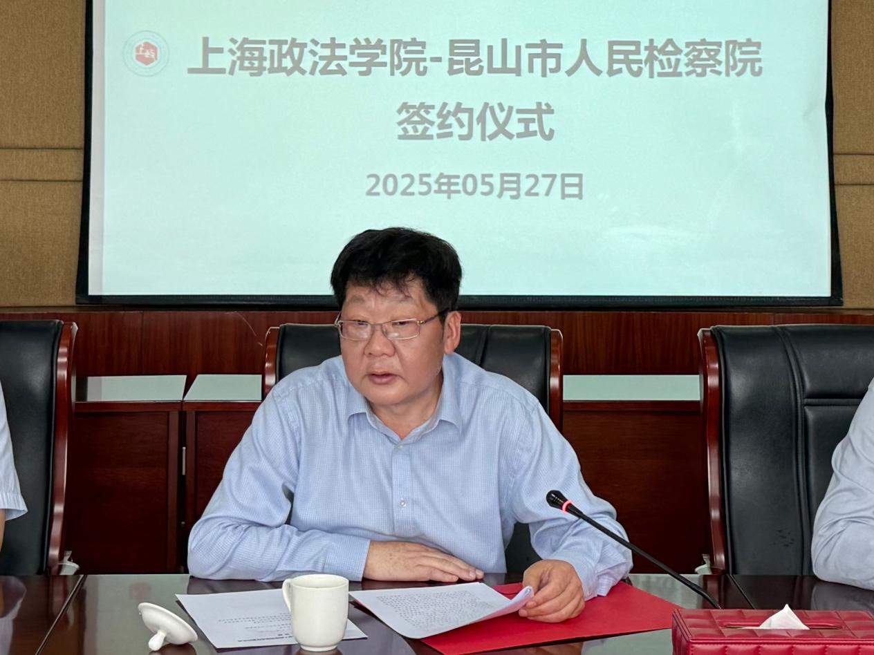 郑少华对昆山市人民检察院一行的到访表示欢迎,并全面介绍了学校近年来的办学情况与中长期发展规划。他指出,双方的合作是积极践行习近平法治思想的生动实践,对于推动法治政府建设、强化法治人才培养具有重要的现实意义。期待通过此次合作,进一步加强双方的交流合作,促进法学教育与检察实践深度融合,实现检察机关与高等院校的资源共享、优势互补,共同探索出法律人才培养的创新模式与有效路径。