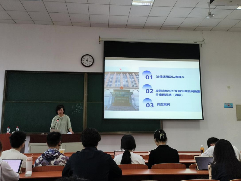 胡宓法官深入探讨了虚假宣传与商业诋毁这两大热点问题,从法律规范的演变切入,详细讲解了相关条款的最新发展。例如,虚假宣传条款新增了对电商平台“销售状况”“用户评价”虚假宣传以及“组织虚假交易”的规制;商业诋毁条款则将“误导性信息”纳入规制范围。她进一步阐述了虚假宣传案件的审理思路:首先需判断宣传内容是否虚假或具有误导性,是否存在片面真实的情况;接着以“一般消费者注意力”为标准,判断是否足以引人误解;最后,原告需对自身损失进行举证。对于商业诋毁案件,她强调行为必须针对竞争对手,并且损害具有直接性,损害可以推定,因此原告的举证责任相对较轻。此次课程为同学们打开了反不正当竞争法知识的大门,通过对讲座中相关法条和案例的学习,同学们对司法实务中不正当竞争案件的审理有了更深刻的理解。