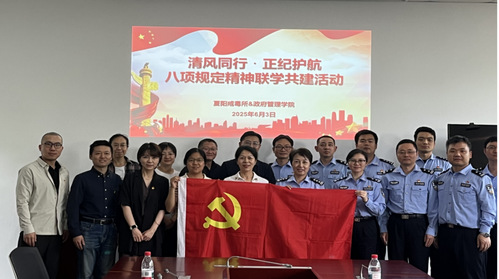 6月3日下午,政府管理学院教工第二党支部与夏阳戒毒所政工党支部开展“清风同行·正纪护航——深入贯彻中央八项规定精神学习教育”联学共建活动。夏阳戒毒所党委委员、纪委书记潘爱华与夏阳强制戒毒所党委委员张克帅,政府管理学院党委书记姚善英、院长汪伟民、学生工作负责人杨铠出席会议。会议由学院教工第二党支部书记庞娇艳主持。