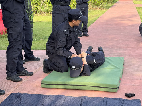 训练现场,晨训教官通过模拟急救场景,手把手指导学生掌握心肺复苏操作流程及AED设备使用,强调“黄金四分钟”救援时效的同时,引导学生在应急处置中体悟劳动实践的责任担当。警务实战教官则围绕警绳捆绑、手铐规范操作展开分组教学,从动作要领到战术配合,让学生在反复练习中淬炼纪律意识与协作能力,将“劳动精神”融入警务技能培养全过程。