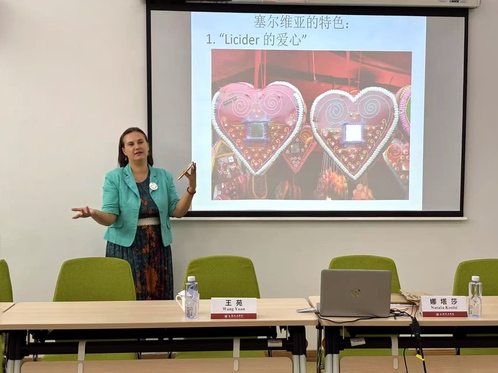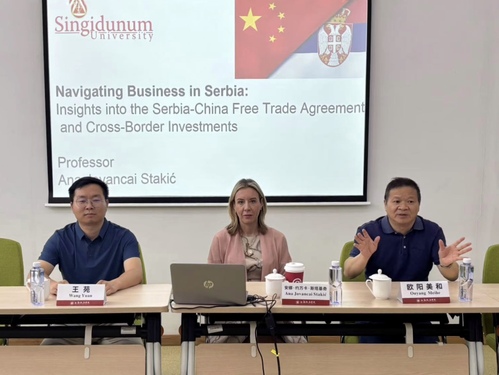 来访期间,安娜·约万卡·斯塔基奇和娜塔莎为我校师生带来由国际交流处主办的“海外讲坛”第137讲——“塞尔维亚商务:塞尔维亚—中国自由贸易协定和跨境投资”,主要探讨了塞尔维亚与中国在经贸领域的往来与合作,中国在塞尔维亚的投资优势与未来展望,以及两国之间深刻的友谊与文化交流。经济管理学院教师王苑主持讲座,讲座现场师生积极互动,气氛热烈。