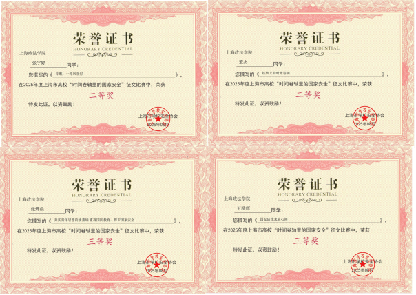 经市教委安全协会聘请相关专家严格评审,我校学子在众多参赛选手中脱颖而出。其中,法律学院张宇婷同学、经济法学院董杰同学凭借出色的文笔和深刻的见解,分别荣获二等奖;经济法学院张烨晨同学、国际法学院王励辉同学表现优异,分别荣获三等奖。这些获奖作品不仅彰显了作者深厚的文字功底,更凸显了他们对国家安全的高度关注与责任感,为全校师生树立了良好的榜样。
