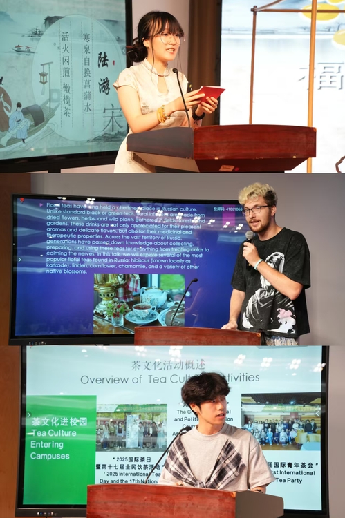 在中外青年对话环节,来自语言文化学院(国际交流学院)的王陈慕蓉和李帅分别以“一颗青橄榄的故事”和“茶香里的青春叙事”为题,讲述了青年大学生对茶的理解,分享了自己在茶文化学习过程中的成长与感悟。来自俄罗斯的“尚合青年”学员Evgenii Kolesov以“Floral Teas of Russia”为题,介绍了俄罗斯多个花茶品类,并分享了自己对茶的喜爱。