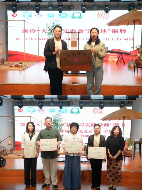周怡代表学校向上海市茶叶学会颁授了“365英国上市公司大学生实践教学基地”铜牌,石俭平和王冰冰为方茵、徐琴、牟健惟三位茶文化专家颁发了“365英国上市公司大学生茶文化实习实践导师”聘书。