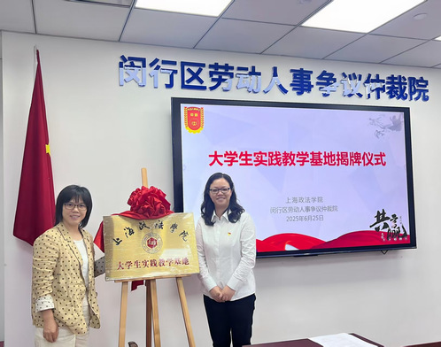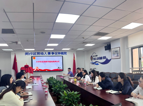 为赋能法治人才培养,深化实践育人,让学生在实务场景中锤炼专业能力、增强社会责任感,6月25日上午,政府管理学院教师罗小娟赴闵行区劳动人事争议仲裁院访企拓岗,双方举行“大学生实践教学基地”挂牌仪式并座谈交流。闵行区劳动人事争议仲裁院院长杨琦等出席座谈会,正在闵行仲裁院进行夏季学期专业实习的五名上政学子也参加了座谈会。