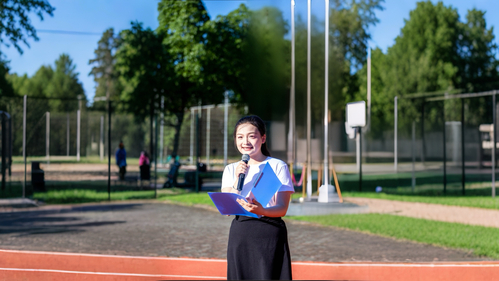 站在鲜艳的国旗下,纪录片学院学生会主席、学生代表付海尘“以青春之我 回应伟大建党精神”为题,作主题演讲。她以我校24名青年学子建功西部的行动为榜样,号召全体同学在新时代的征程上,以青春之我昂扬的姿态,做挺膺担当的奋斗者。