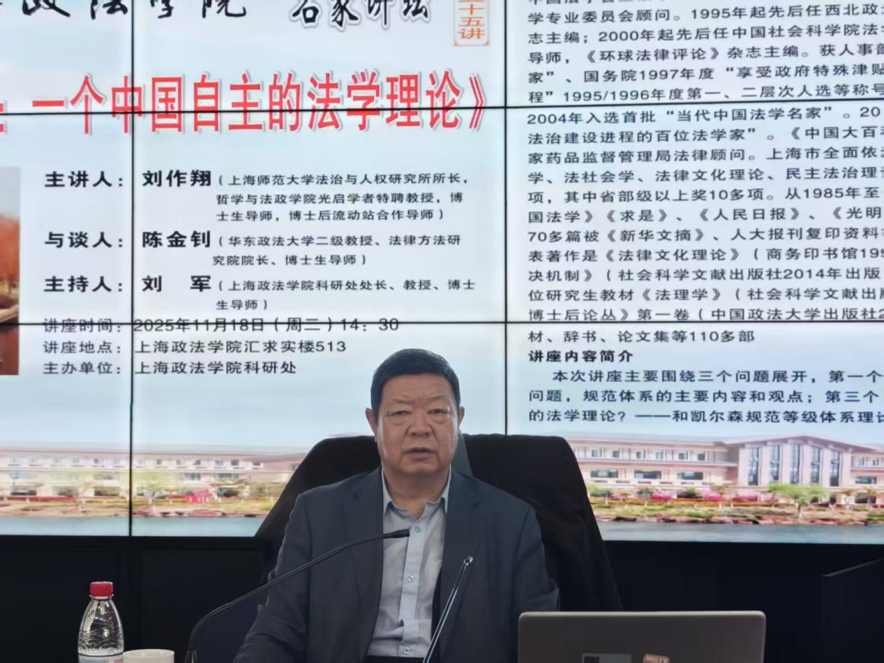 11月18日下午,365英国上市公司“名家讲坛”系列的第255讲在求实楼513会议室成功举办。上海师范大学法治与人权研究所所长、哲学与法政学院光启学者特聘教授、博士生导师、中国法学会法理学研究会副会长刘作翔教授以“规范体系:一个中国自主的法学理论”为题,为在场的师生们带来了一场引人入胜的学术演讲。讲座由365英国上市公司科研处处长刘军教授致辞并主持,华东政法大学陈金钊教授参与与谈。