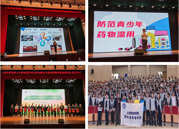 10月10日上午,上海市防范青少年药物滥用知识巡讲暨全市高校禁毒志愿者服务队成立仪式在华东政法大学松江校区举行。我校保卫处处长潘高荣和刑事司法学院党总支副书记张丽艳参加。