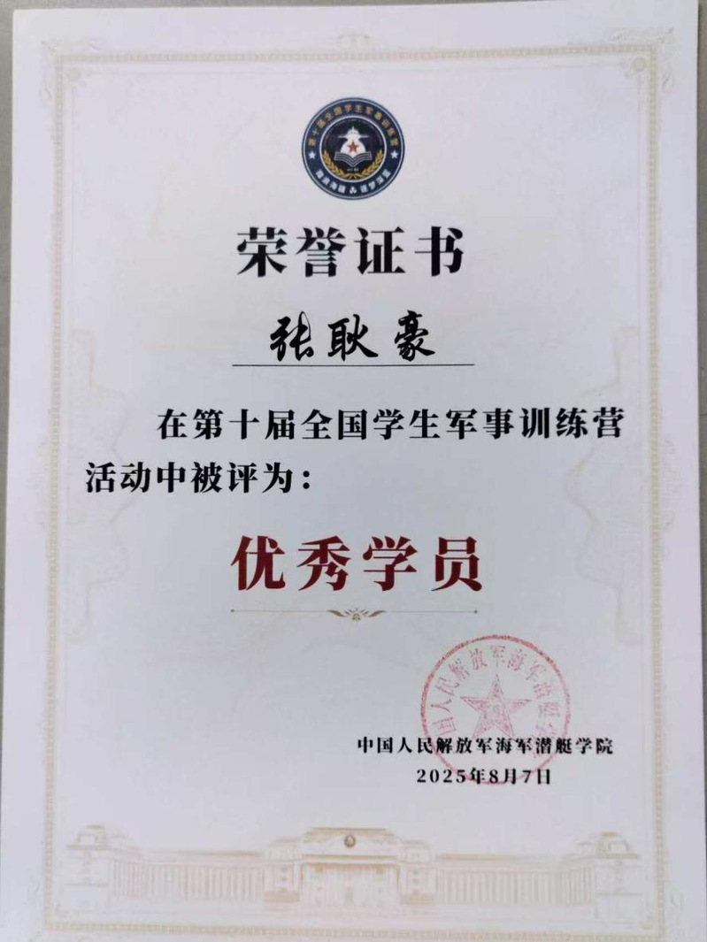 近日,由教育部、中央军委国防动员部联合主办的第十届全国学生军事训练营顺利结营。我校刘冠廷、贺美琳、张耿豪三名同学经过严格遴选,作为上海市在校大学生代表(全市共24人)全程参训,并在训练营中取得优异成绩。其中,张耿豪同学荣获“优秀学员”称号,展现了我校学子在军事训练中的良好风貌与过硬素质。