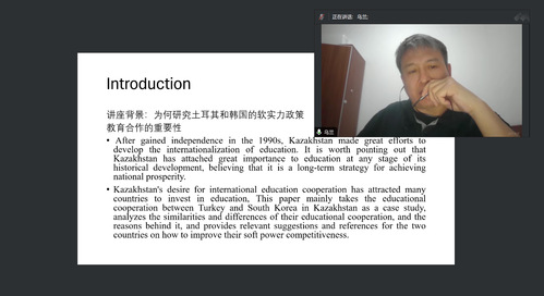 On April 18, the overseas lecture--“Soft Power policy analysis of Turkey and South Korea in Kazakhstan: A case study of educational cooperation” was held online. The lecture was delivered by Assoc. Prof. Ulan Nuhan, KIMEP University and hosted by Assoc. Prof. Tan Tan, Deputy Dean of the School of Government.