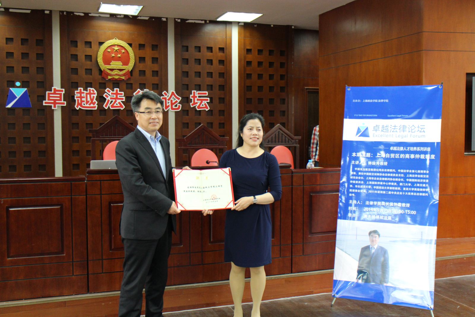 5月13日下午,法律学院在庸夫楼模拟法庭举行卓越法律论坛第十一期,本次论坛邀请了中国东方航空集团总法律顾问郭俊秀教授。郭教授是上海法学会航空法研究会会长、上海市企业法律顾问协会副会长,中国国际经济贸易仲裁委员会、上海国际仲裁中心仲裁员,上海交通大学、厦门大学、中国政法大学、华东政法大学兼职教授,复旦大学高级律师学院理事会理事。2011年获得第二届中央企业十大优秀总法律顾问称号。此次卓越法律论坛郭教授主讲了“中国(上海)自贸区的商事仲裁制度”。论坛由法律学院院长侯怀霞教授主持,卓越人才培养试点班和人民调解班学生参加讲座。