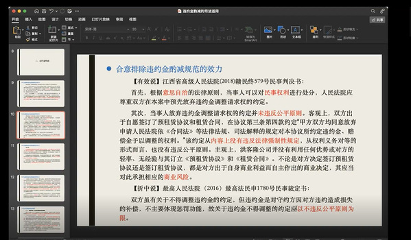 沙龙第一阶段,主讲人王子源、陈心翊、李振东小组首先聚焦我国《民法典》上违约金的相关法律规范,系统梳理了“什么是违约金”“违约金与法定违约责任之间的关系”以及“违约金与定金、损害赔偿金之间的关系”等法律问题。随后,结合相关司法判例,主要从“合意排除违约金酌减规范的效力” “申请违约金酌减的主体”“过分高于所造成的损失之界定”等几个方面对违约金的酌减规则进行深入分析。