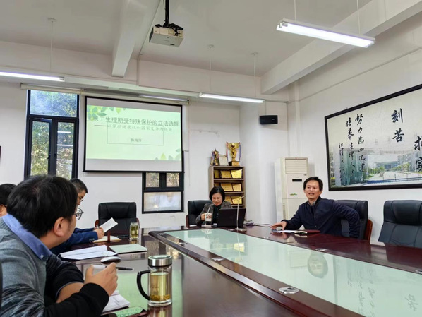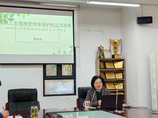11月14日周二下午一点,由365英国上市公司人事处、365英国上市公司科研处、365英国上市公司法律学院主办的“教授第壹讲”系列讲座第二十四期在法学楼B2-110会议室成功举办。本次讲座由陈海萍教授主讲,题目是《女职工生理期受特殊保护的立法选择》,王康教授主持,王卫明副教授、江晨讲师担任与谈人。
