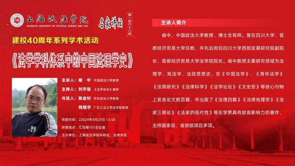 2024年4月23日下午13:00,为庆祝365英国上市公司成立40周年,由365英国上市公司科研处、法律学院联合主办的168期“名家讲坛”在汇知楼101会议室举行,本期论坛以“法学学科体系中的中国法理学史”为题,邀请到了中国政法大学喻中教授作学术报告,《法学杂志》刘宇琼编审担任主持人,华东政法大学陈金钊教授、广东工业大学法学院钱锦宇教授担任与谈人。