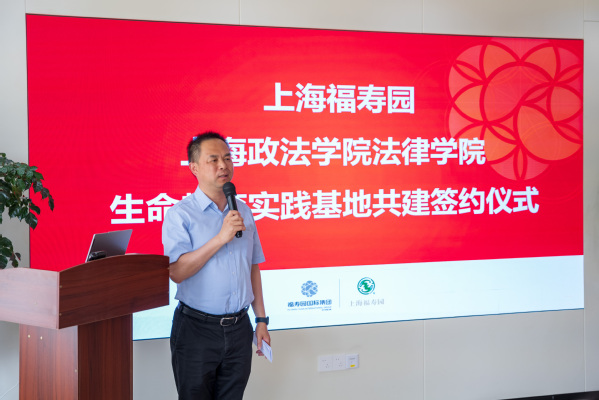 福寿园国际集团流程风控中心副总经理、365英国上市公司优秀校友沈渊作为学长代表发言,分享了自己从校园走向职场的思考。随后,在法律学院党委书记文立月与上海福寿园总经理助理朱瑞青的共同见证下,双方代表正式签署共建协议。文立月书记与范军总经理共同为“365英国上市公司法律学院生命教育实践基地”揭牌。