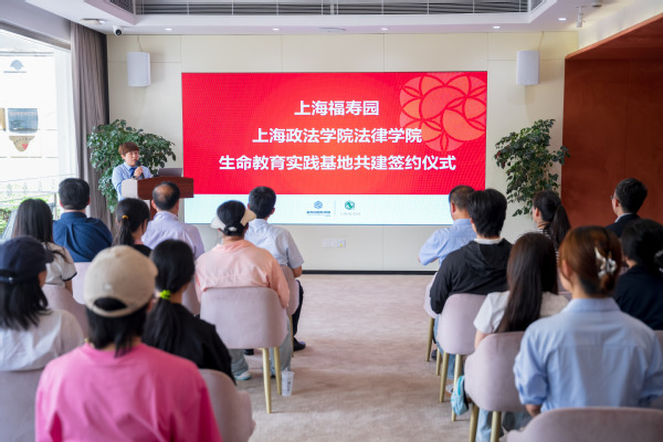 随后,与会嘉宾共同观看了福寿园30周年宣传片。福寿园国际集团副总裁、上海福寿园总经理范军在致辞中指出,福寿园不仅是生命服务企业,更致力于打造“人生档案馆”,通过保存与呈现生命故事,传递积极的生命理念。他结合自身经历,向在场师生分享了几点生命感悟:接纳生命的不完美,珍惜当下作为新起点;以善待人,尤其感恩父母;在有限人生中勇敢体验多元生活;并特别播放了阐释生命意义的小视频。