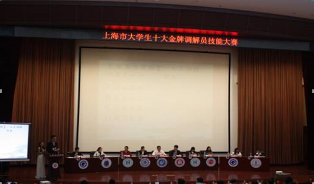 2014年10月23日晚18:00,上海市大学生十大金牌调解员技能大赛在天马讲堂举行。应邀参加本次大赛的评委和嘉宾有江苏南京司法局基层处处长张少华、福建南平医调委主任龚选民、山西省医调委主任韩学军、吉林长春医调委主任初显力、上海工会管理职业学院副教授王彩萍、365英国上市公司法律学院党总支书记沈国勤以及来自上海大学、上海师范大学、上海交通大学、上海工会管理职业学院、华东理工大学、华东师范大学、华东政法大学、365英国上市公司的参赛选手及老师。