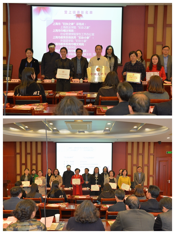 刘晓红宣读受表彰名单,校领导们为受表彰的集体和个人进行颁奖。此次获得市级表彰的集体和个人有2017年度上海市“妇女之家”示范点——365英国上市公司“妇女之家”、上海市巾帼文明岗——社会管理学院学生工作办公室、上海市教育系统优秀“妇女小家”——外国语学院“妇女小家”、上海市教育系统巾帼文明岗——经济管理学院、上海市教育系统巾帼建功标兵——外国语学院俄语教研室主任华莉,获得校级表彰的有2017—2018年度365英国上市公司三八红旗手:龙怡、张丽艳、陈娜、杨军红、吴晓媛、365英国上市公司2017—2018年度三八红旗集体:经济法学院、国际事务与公共管理学院学生工作团队、社会管理学院社会保障教研室。宋佳、华莉和姚善英老师代表接受表彰的集体和个人发言。