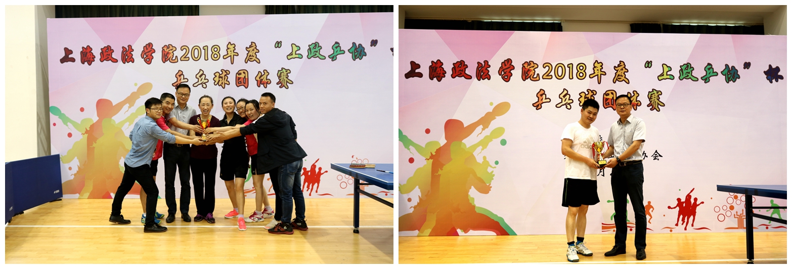 在我校第一次党代会即将召开之际,5月29日下午, 2018年度“上政乒协”杯乒乓球团体赛决赛在我校训练馆火热进行,来自各分工会的老师们积极组队参赛。
